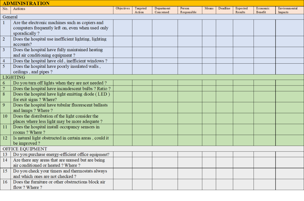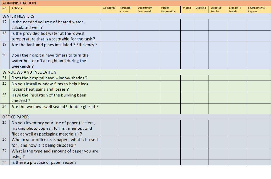In order to get the financial return from such corrective measures, the hospital must set an action plan for the daily management of its activities. To identify the hospital’s strong points, recognize its weaknesses, and define its perspectives there should be some kind of internal organization and a clear allocation of responsibilities. The development of an action plan enables the implementation of the corrective measures by specifying the means allocated (financial, technical, human, etc.) and the deadline for the actual impel Objective Implement Integrated Pest Management (IPM ) to prevent and manage pest problems in the least hazardous manner possible . Targeted action Regular inspection for pests, especially in food service. areas Identification of problem. areas, education of engineering and environmental services staff on IPM methods cleanliness Regular monitoring and evaluation mentation. Appointing qualified persons to implement the active measures is essential. At the same time, coordination bet the departments that face the same problem (such as exceed consumption of water or energy, or inadequate waste management) is necessary for reaching the performance targets. The reactive measures and their results should be assessed and commented regularly in order to evaluate progress and plan pos additional improvements or corrective measures.